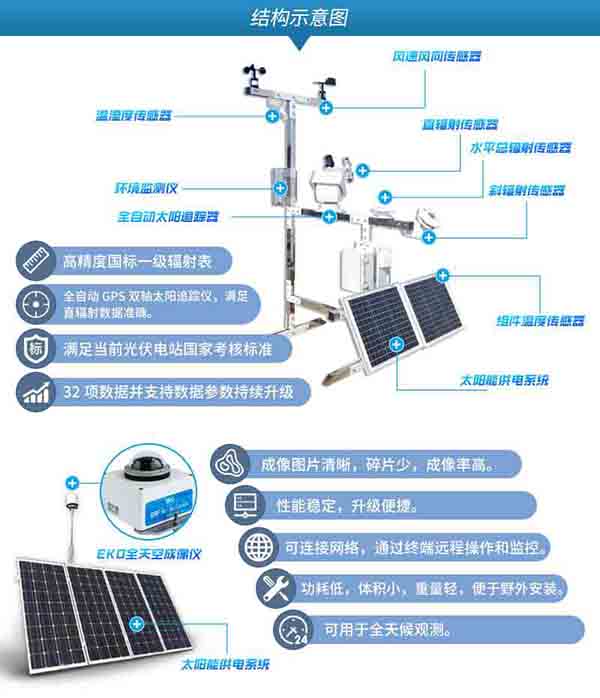 太陽能光伏監控系統就是將光伏電站的逆變器、匯流箱、輻照儀、氣象儀、電表、天空成像儀等設備通過數據線連接起來,用光伏電站數據采集器進行這些設備的數據采集,并通過GPRS、以太網、WIFI等方式上傳到網絡服務器或本地電腦,使用戶可以在互聯網或本地電腦上查看相關數據,方便電站管理人員和用戶對光伏電站的運行數據查看和管理。